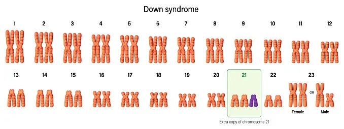 Karyotype of Down syndrome. Autosomal abnormalities. Trisomy 21. Genetic disorder caused when abnormal cell division results in an extra full
